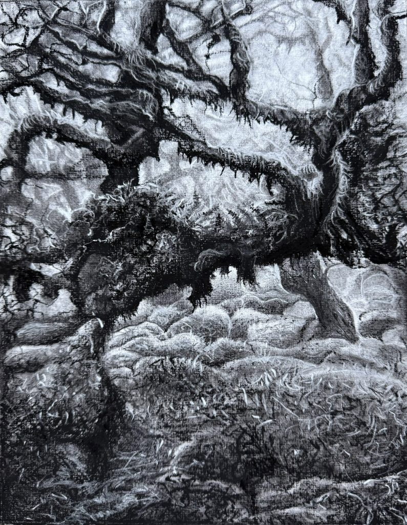 Zeitgenössische Zeichnung und Malerei an der Schnittstelle von Figuration und Natur. Im Zentrum stehen organische Strukturen, Verflechtungen und Übergänge zwischen Körper und Landschaft. Die Arbeiten untersuchen Verdichtung, Wahrnehmung und die Auflösung klarerer Grenzen zugunsten komplexer, miteinander verbundener Bildräume.