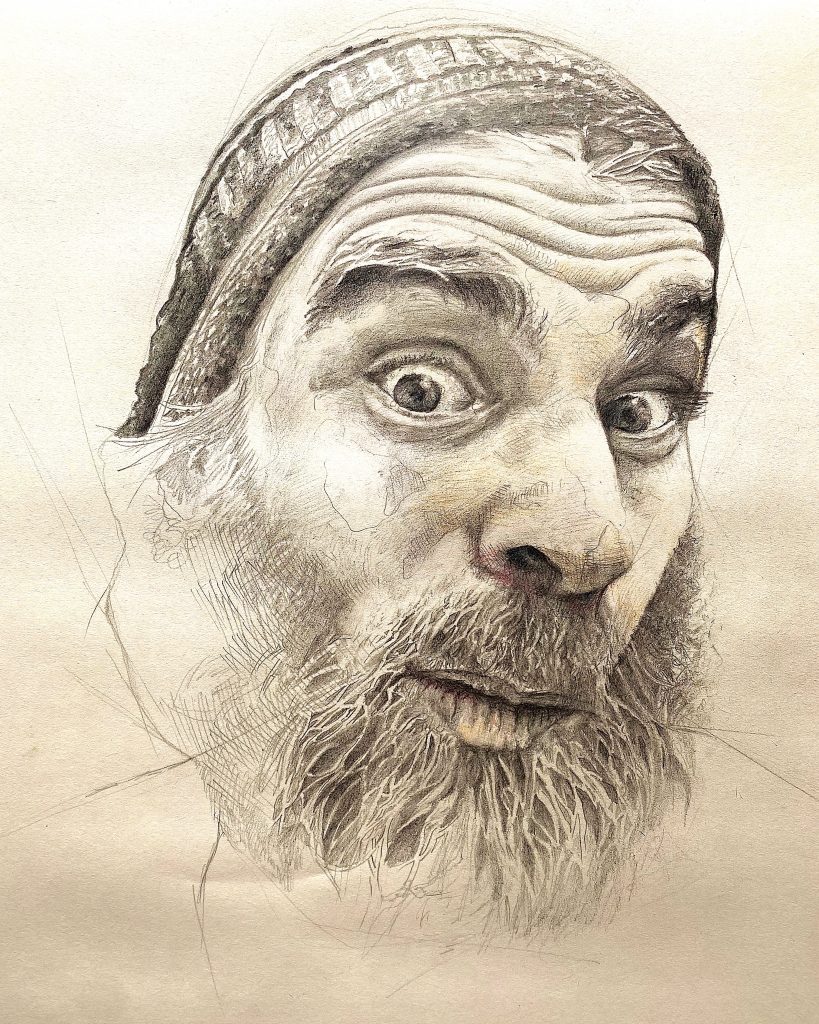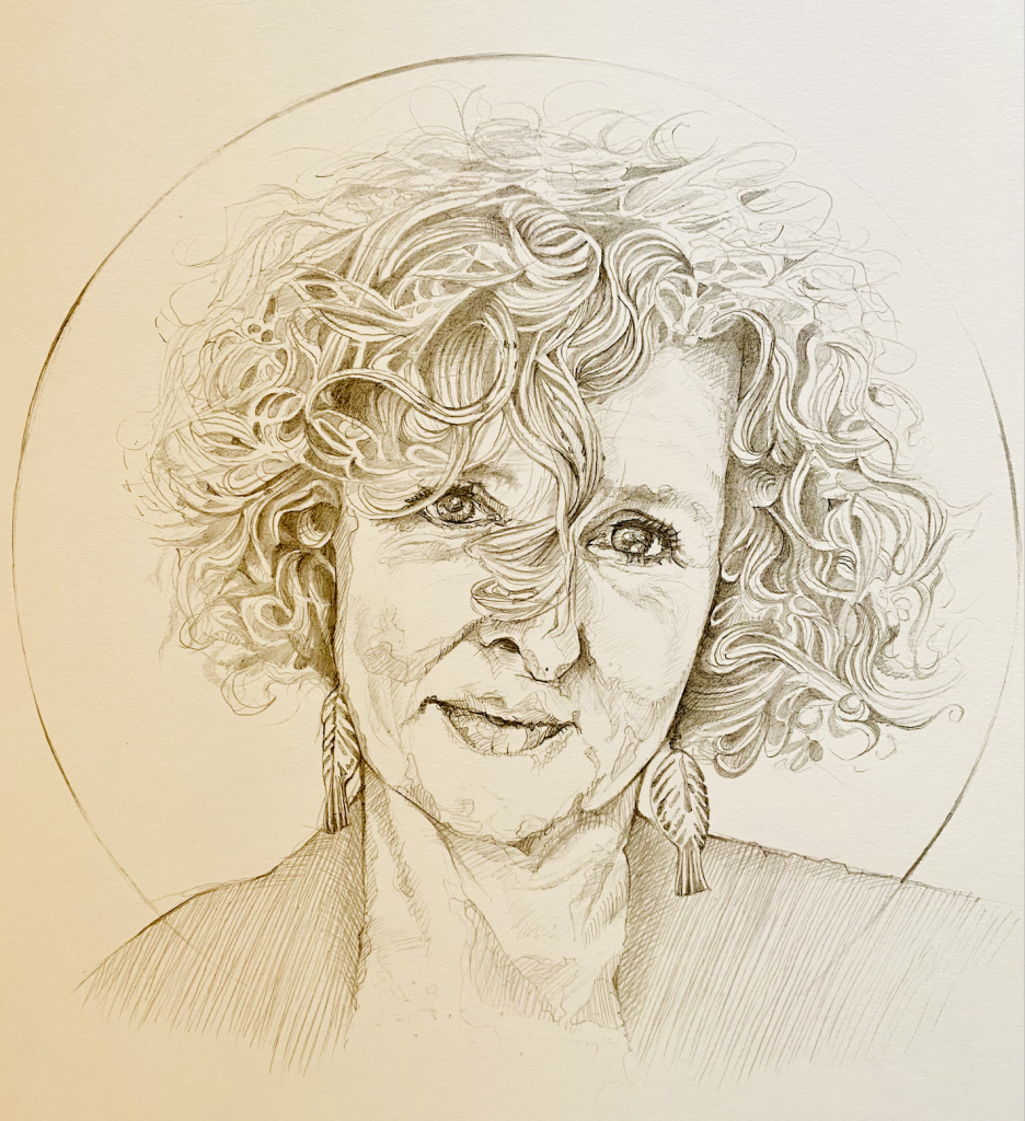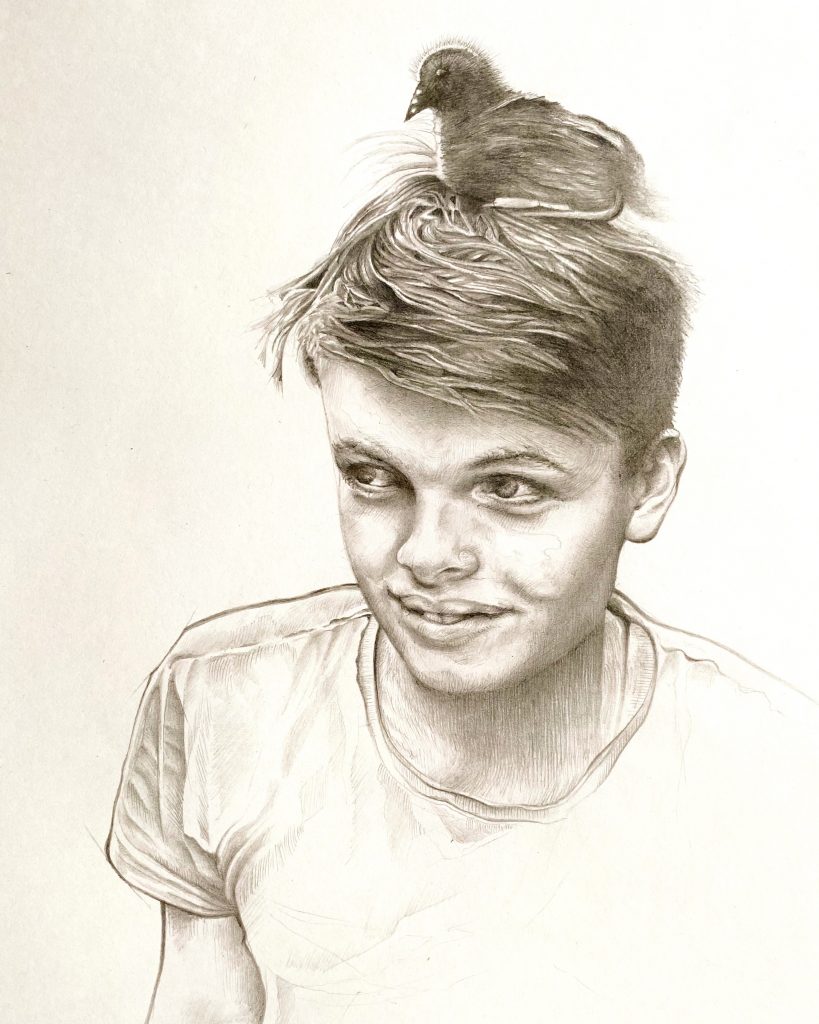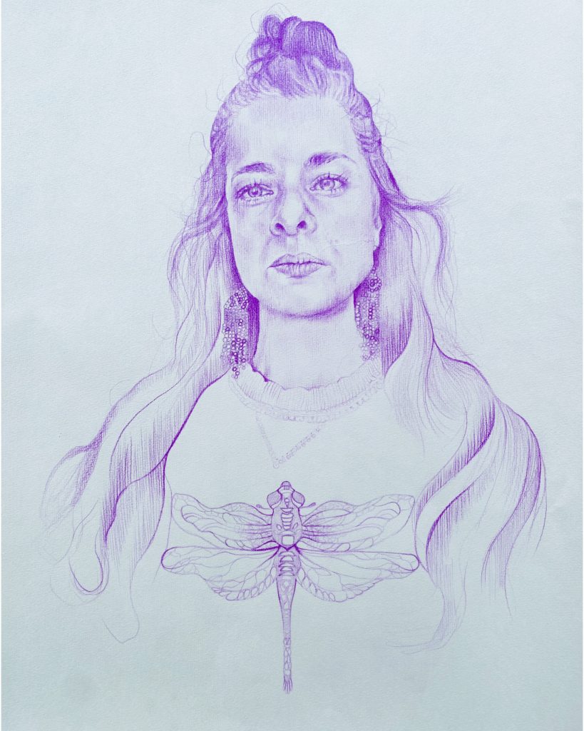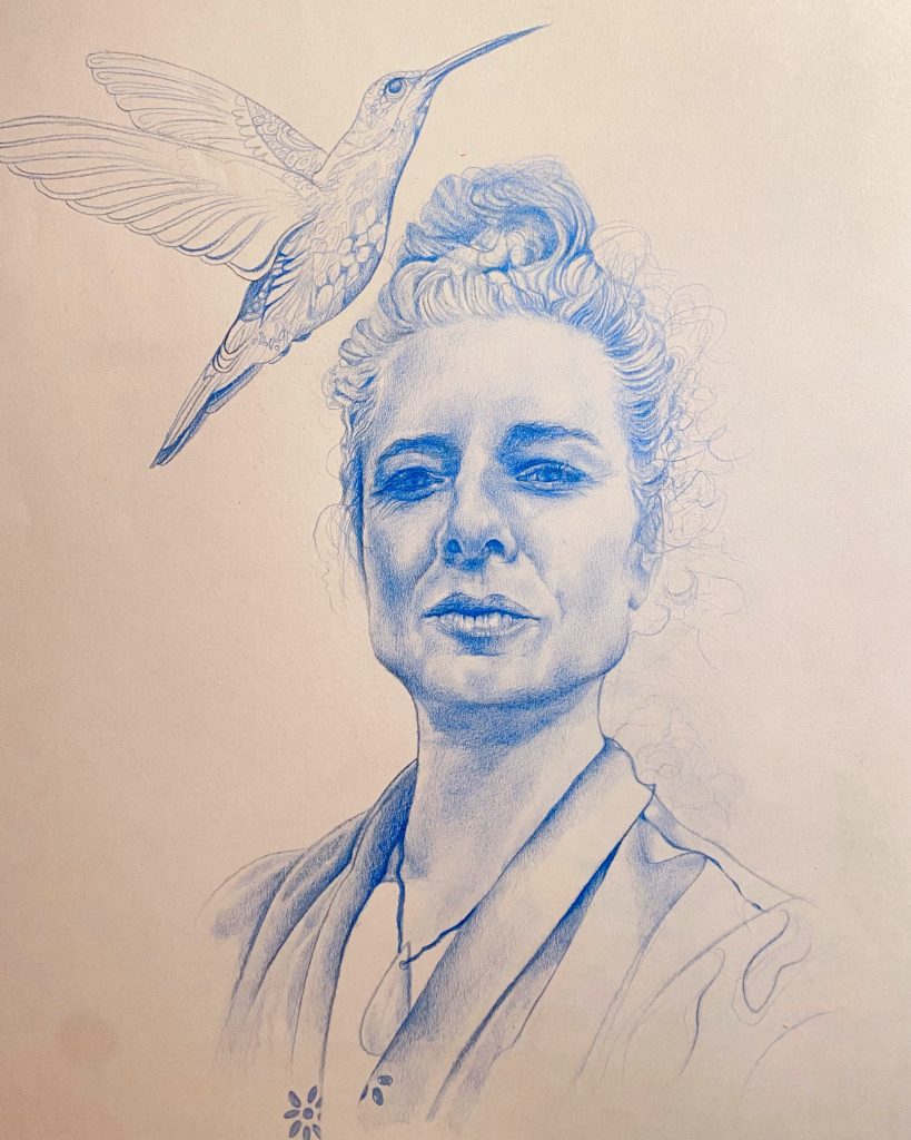 „Self-portrait with hummingbird“ colored pencil 2025 © Sara Heinrich